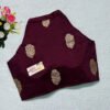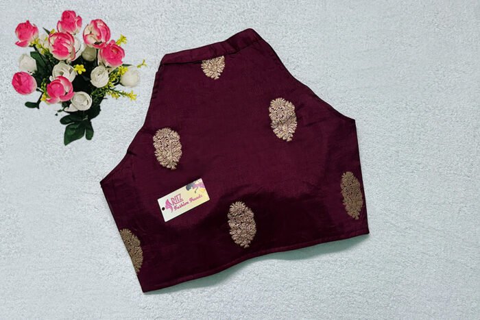 This is a Maroon Color Russian Silk Blouse. This Blouse is V-Slit Halter Neckline in Frontside & High Neckline in Backside with Mandarin Collar. This is a Princess Cut, Padded, Sleeveless Blouse with Front Open. You can team it up with any contrast-colored Traditional/Printed Saree.