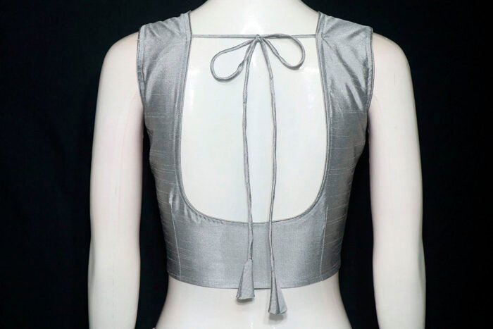 This is a Slate Gray Color Raw Silk Blouse. This Blouse is U Neckline in both Frontside and Backside with Tie Up. This is a Non-Padded, Choli-Cut (Used Sponge) Blouse. This a Sleeveless Blouse with Front Open. You can team it up with any contrast color Printed or Traditional Saree.