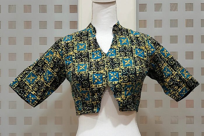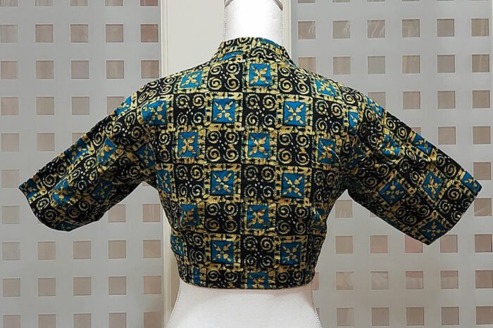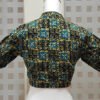 This is a Black Multi Color Cotton Block Printed Blouse. It is Halter Arrow Neckline in Frontside and High Neckline in Backside with Mandarin Collar. This is a Princess Cut, Non-Padded, Glass Sleeve Blouse with Front Open. You can team it up with any contrast colored saree.
