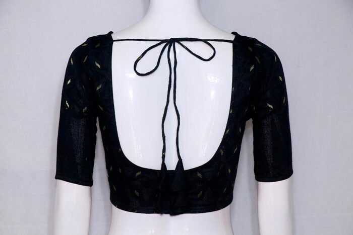 This is a Black Color Jamdani Blouse With Leaf Motif  Zari And Thread Texture. It is Sweetheart Neckline in Frontside and U-Neckline in Backside with Tie Up. This is a Princess Cut Padded Blouse. This Blouse is Glass Sleeve and Back Open. You can team it up with any contrast colored Traditional Saree.