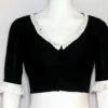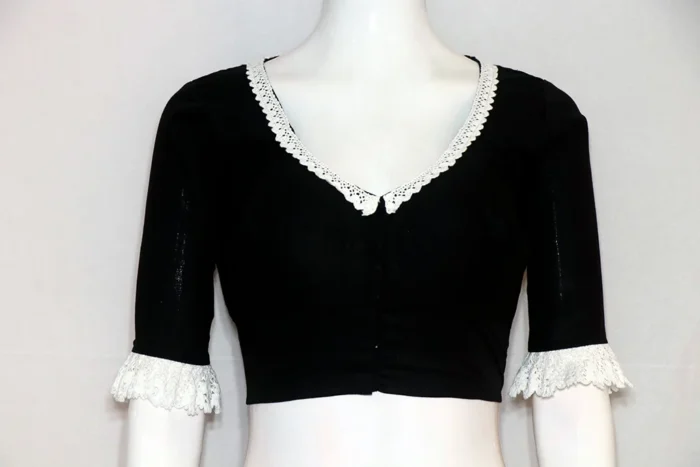 This Blouse Comes in Black Color Rubia Cotton with Multicolor Devotional Motif Hand-Painted. In this Blouse V-Neckline in Frontside and Boat Neckline in Backside with Hakoba Lace Work. This Blouse is Choli Cut Non-Padded Blouse. It is a Glass Sleeve with Front Open. You can team it up with any contrast colored Printed or Traditional Saree.