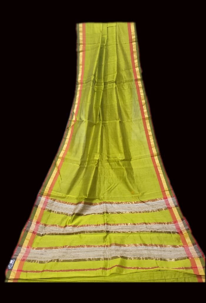 Moss Green Color Maheshwari Silk Saree with Contrast Red Color Border. It comes with a Matching Blouse Piece. This is a perfect Choice for any Types Of Occasions.