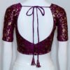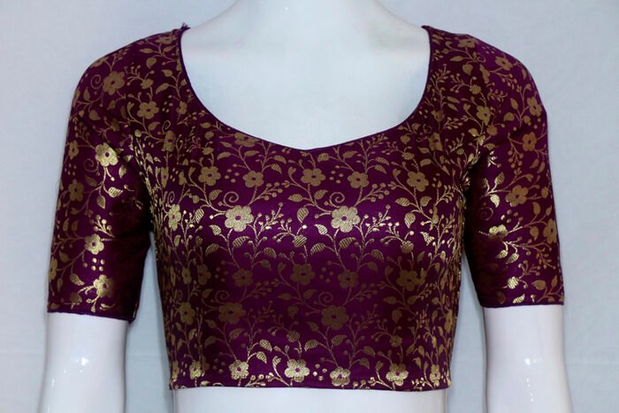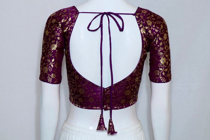 This is a Purple Color Brocade with Zari Work Blouse. It is Leaf Neckline in Frontside and Backside with Tie Up. This is a Princess Cut Padded Blouse. This Blouse is Glass Sleeve and Back Open. You can team it up with any contrast colored Printed or Traditional Saree.