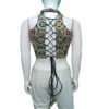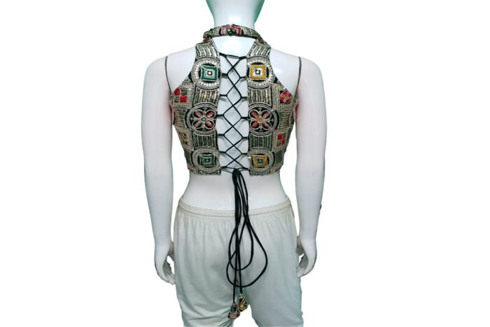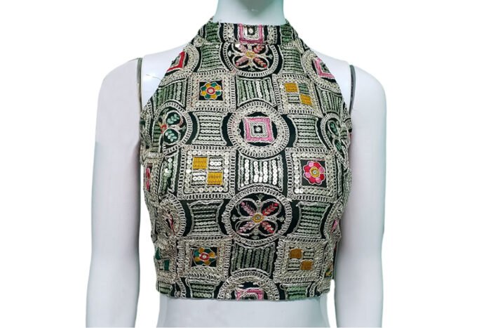 This is a Green Multi Color Heavy Embroidered Blouse. This Blouse is Halter-Neckline in Frontside and High Neckline in Backside with Criss-Cross Tie-Up. This is a Princess Cut, Padded, Sleeveless Blouse with Back Open. You can team it up with any contrast colored Printed or Traditional Saree.