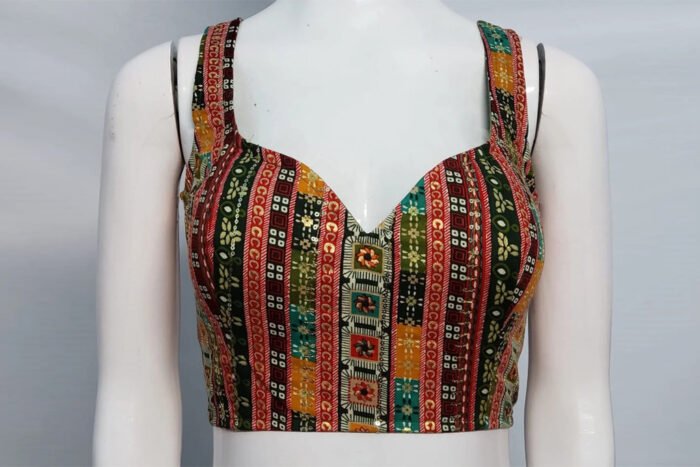 This is a Green Multi Color Printed Rayon Blouse. This Blouse is Sweet-Heart Neckline in Frontside and U- Neckline Backside with Tie-Up. This is a Princess Cut, Padded & Sleeveless Blouse with Back Open. You can team it up with any contrast colored Printed or Traditional Saree.