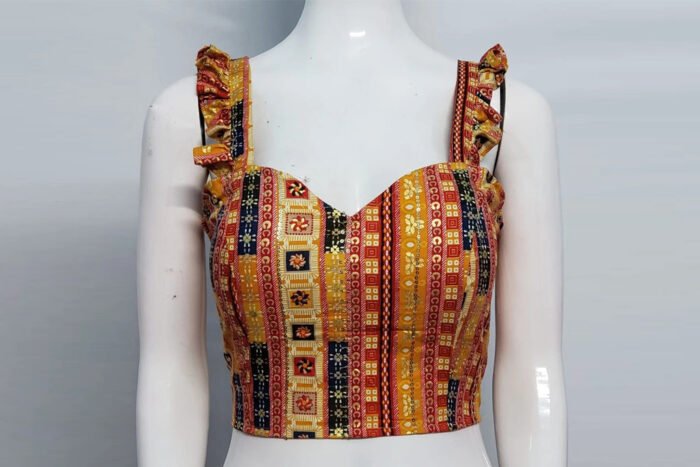 This is a Yellow Multi Color Printed Rayon Blouse. This Blouse is Sweet-Heart Neckline in Frontside and Square Neckline in Backside. This is a Princess Cut, Padded & Sleeveless with Pleats Blouse & Back Open. You can team it up with any contrast colored Printed or Traditional Saree.