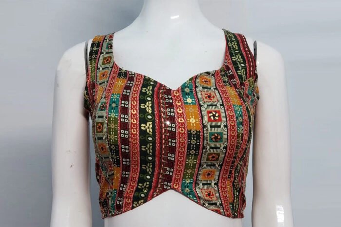 This is a Multi Color Rayon Blouse. This Blouse is Sweetheart Neckline in Frontside and U-Neckline in Backside with Tie Up. This is a Princess Cut, Padded & Sleeveless Blouse with Back Open. You can team it up with any contrast colored Printed or Traditional Saree.