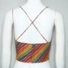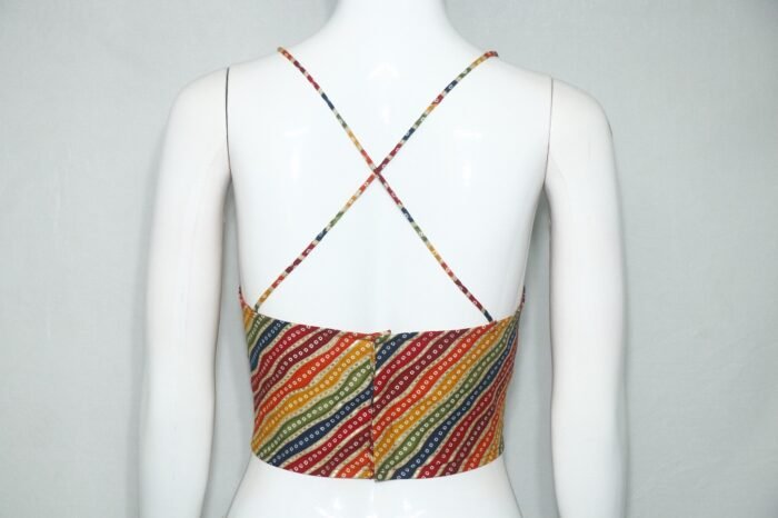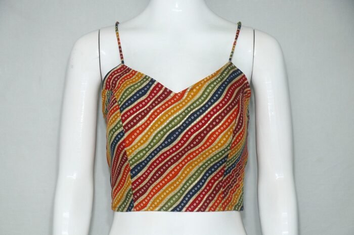 This is a Multi Color Rayon Spaghetti with an Abstract Motif. This Blouse is Single Spaghetti Strap with V-Neckline in Frontside and Band Neckline in Backside with Criss Cross Strap and Tie-Up. This is a Princess Cut Padded Blouse with Back Open. You can team it up with any contrast colored Traditional or Printed Saree.