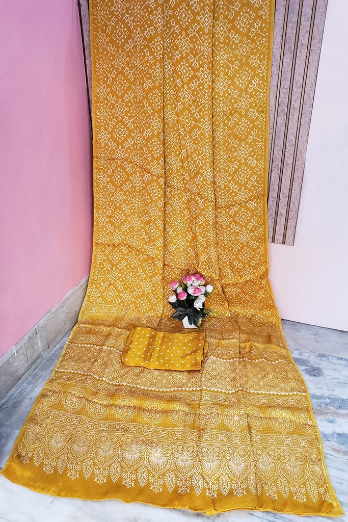 Mustard Color Ajrakh Printed Modal Silk Saree.