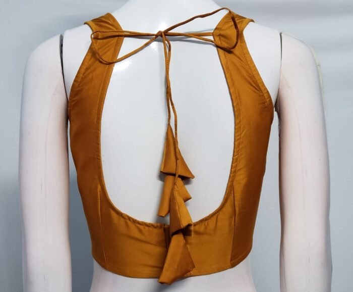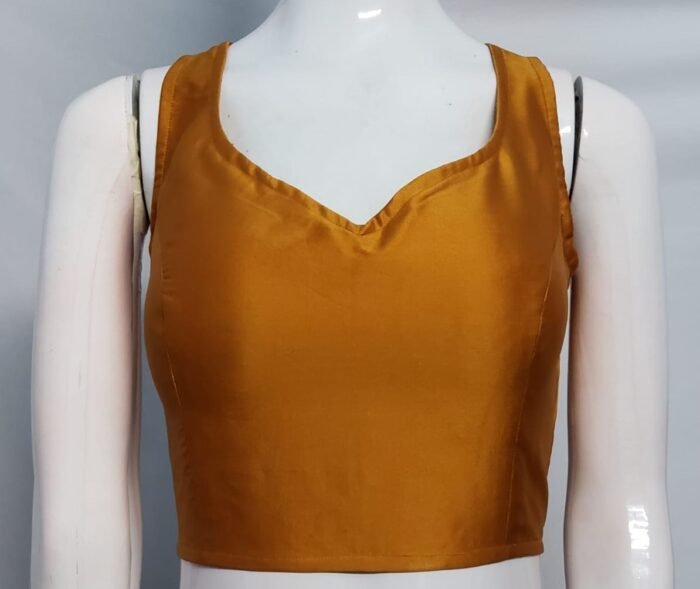 This is a Rust Color Samo Silk Blouse. This Blouse is Sweetheart Neckline in Frontside and U-Neckline in Backside with Tie Up. This is a Princess Cut, Padded, Sleeveless Blouse with Back open. You can team it up with any contrast colored Printed or Traditional Saree.