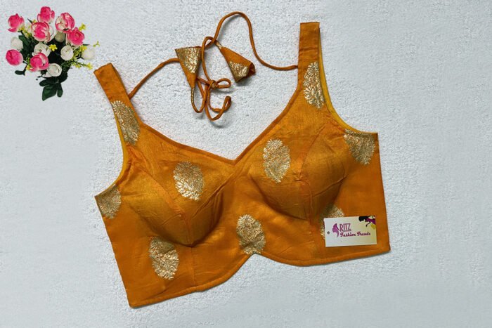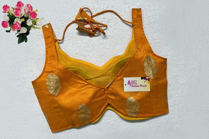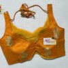 This is a Mustard Color Russian Silk Blouse. This is V-Neckline in both Frontside & Backside with Tie-Up. This is a Princess Cut, Padded, Sleeveless Blouse with Back Open. You can team it up with any contrast-colored Traditional/Printed Saree.