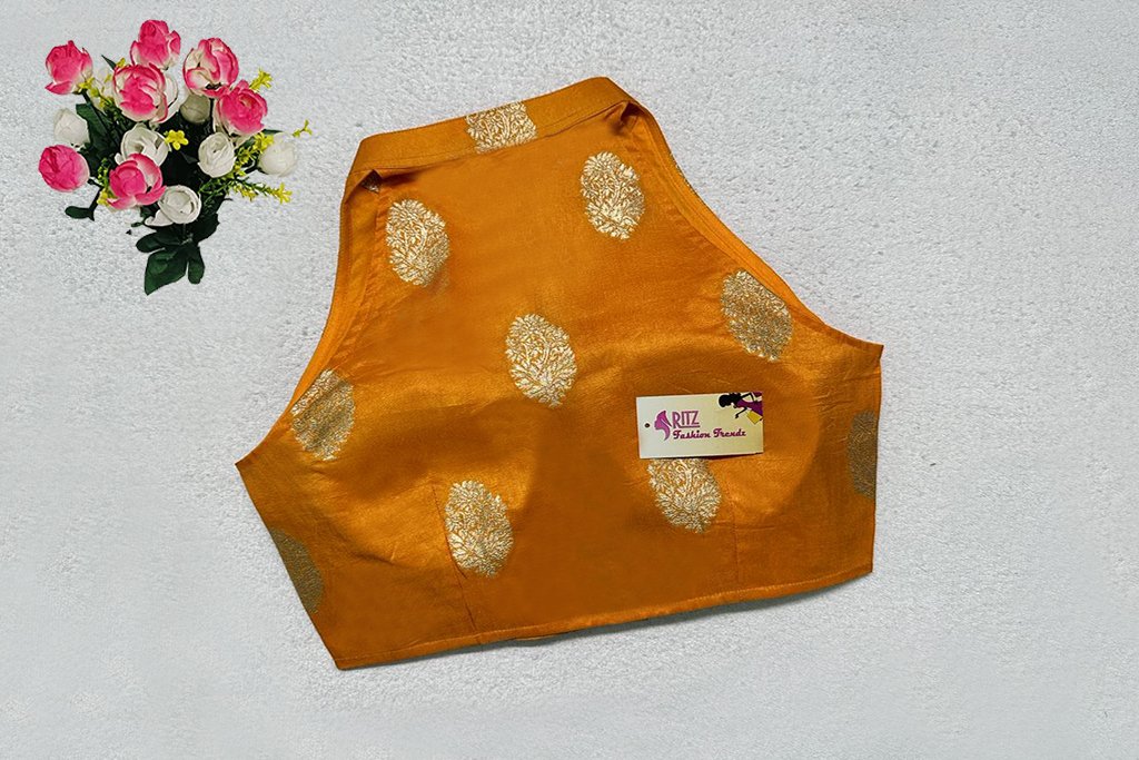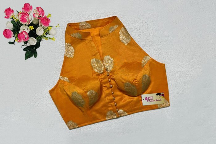 This is a Mustard Yellow Color Russian Silk Blouse. This is a V-Slit Halter Neckline Blouse in Frontside & High Neckline in Backside with Mandarin Collar. This is a Princess Cut, Padded, Sleeveless Blouse with Front Open. You can team it up with any contrast-colored Traditional/Printed Saree.