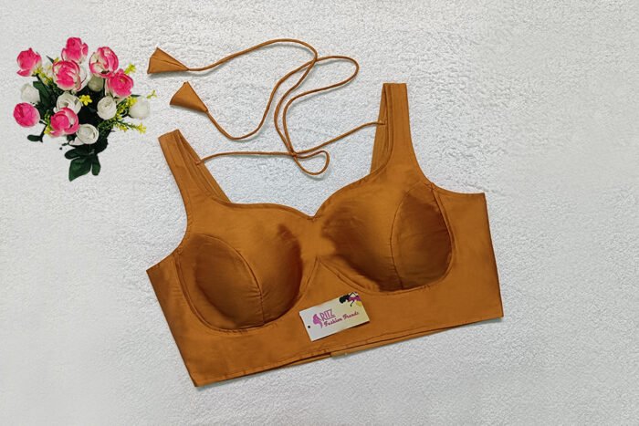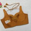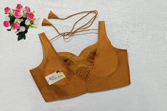 This is a Mustard Color Samo Silk Blouse. This Blouse is Sweetheart Neckline in Frontside & Leaf-Neckline in Backside with Tie-Up. This is a Princess Cut, Padded, Sleeveless Blouse with Back Open. You can team it up with any contrast-colored Traditional/Printed Saree.