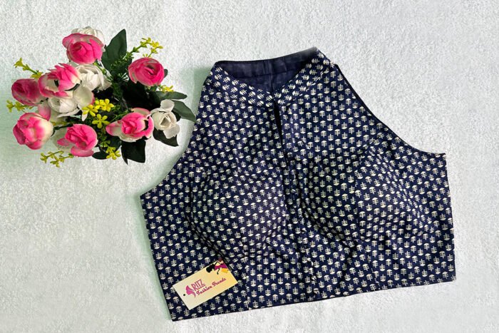 This is a Navy Blue & Off-White Cotton Printed Blouse. This Blouse is Halter Neckline in Frontside & High Neckline in Backside with Mandarin Collar. This is a Princess Cut, Padded, Sleeveless Blouse with Front Open. You can team it up with any contrast-colored Traditional/Printed Saree.
