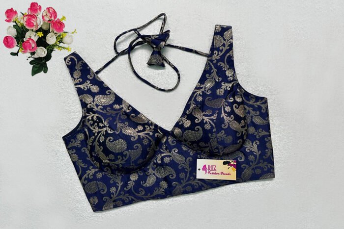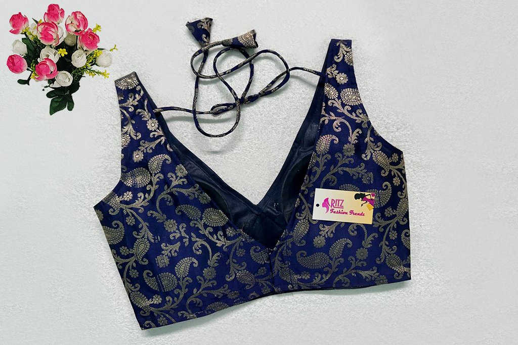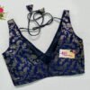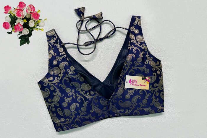 This is a Navy Blue Color Brocade Blouse. This is a V-Neckline Blouse in both Frontside & Backside with Tie-Up. This is a Princess Cut, Padded, Sleeveless Blouse with Back Open. You can team it up with any contrast-colored Traditional/Printed Saree.