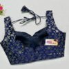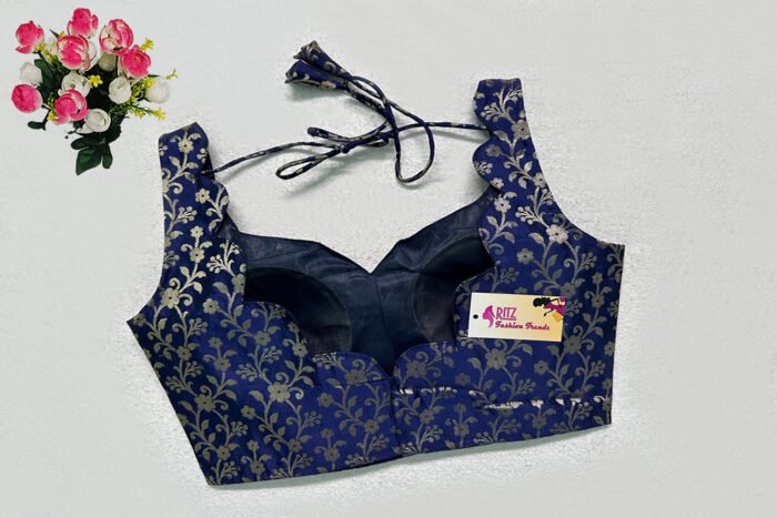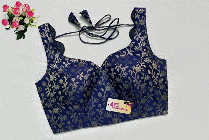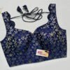 This is a Navy Blue Color Brocade Blouse. This is a Sweetheart Neckline Blouse in Frontside & Scallop Neckline in Backside with Tie-Up. This is a Princess Cut, Padded, Sleeveless Blouse with Back Open. You can team it up with any contrast-colored Traditional/Printed Saree.