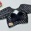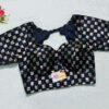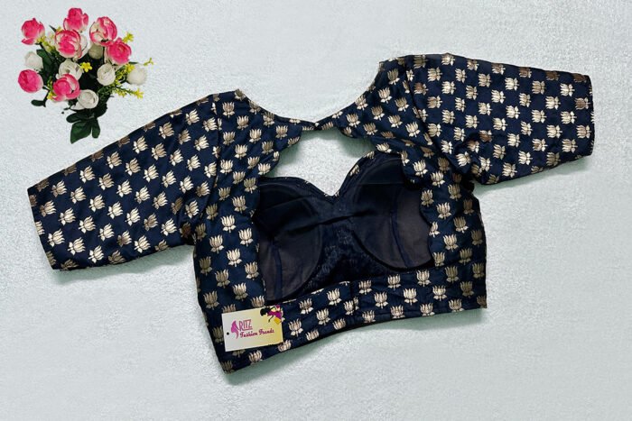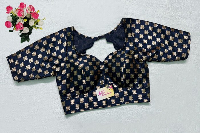 This is a Navy Blue Color Chanderi Silk Blouse. This is Sweetheart-Neckline in Frontside & Scallop Keyhole Neckline in Backside. This is a Princess Cut, Padded, Glass Sleeve Blouse with Back Open. You can team it up with any contrast-colored Traditional/Printed Saree.