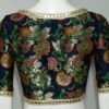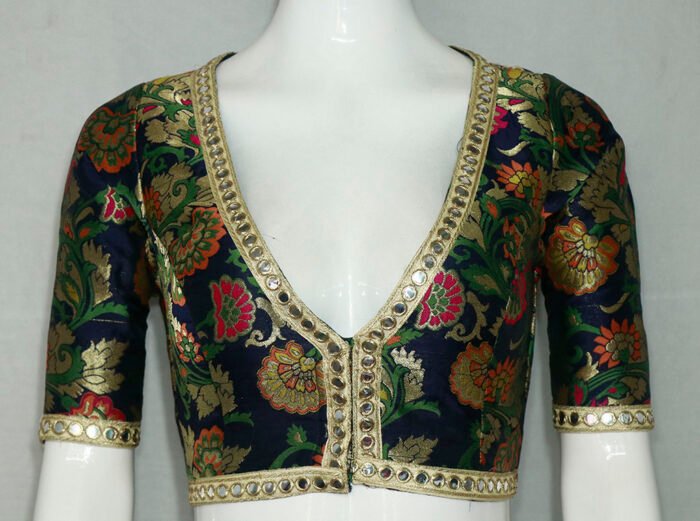 This is a Navy Blue Color Meena Kari Benarasi Blouse. This Blouse has designed with Zari Lace Foil Mirror in Sleeves and Neck. This Blouse is V-Neckline in Frontside and High Neckline Backside. This is a Princess Cut Padded Blouse with Front Open. You can team it up with any contrast colored Traditional Saree.