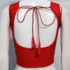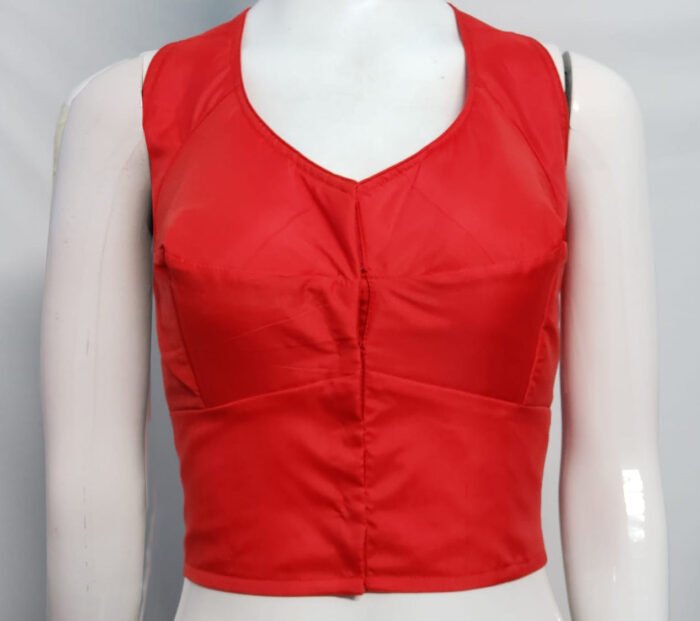 This is a Red Color Samo Silk Blouse . This Blouse is Leaf Neckline in Frontside and U-Neckline in Backside with Tie-Up. This is a Choli-Cut, Non-Padded, (Used Sponge) Sleeveless Blouse with Front open. You can team it up with any contrast colored Printed or Traditional Saree.