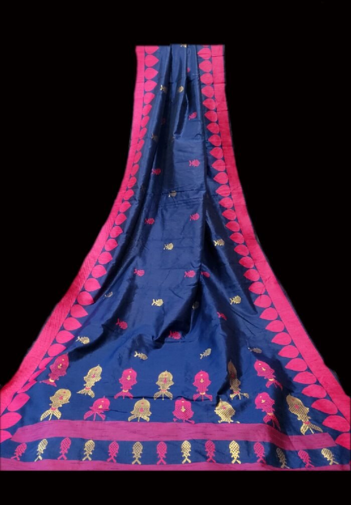 Navy Blue Color Silk Saree with Multicolor Fish Motif Thread Work.