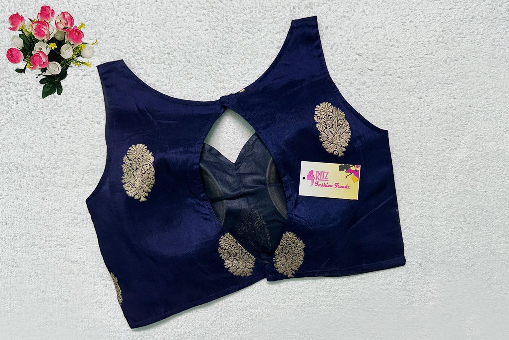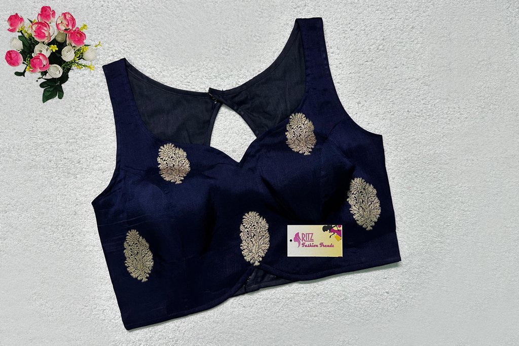 This is a Navy Blue Color Russian Silk Blouse. This is V-Neckline in Frontside & Key-Hole Neckline in Backside. This is a Princess Cut, Padded, Sleeveless Blouse with Back Open. You can team it up with any contrast-colored Traditional/Printed Saree.