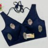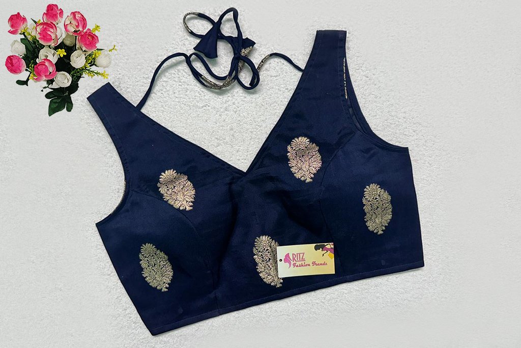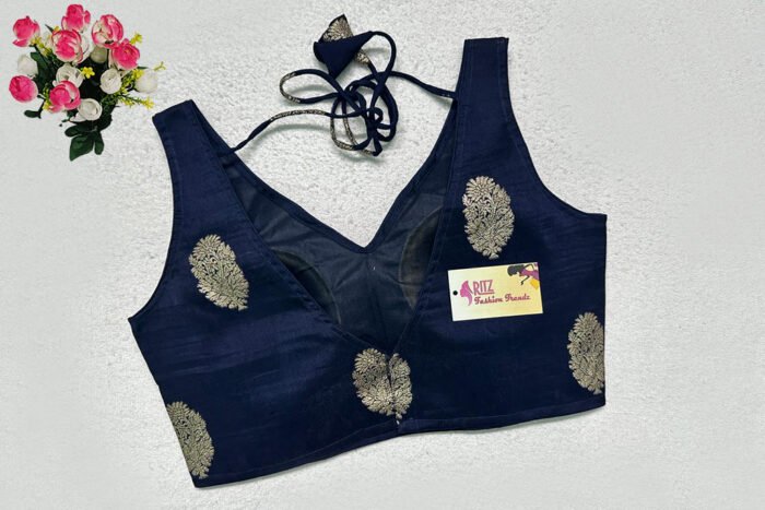 This is a Navy Blue Color Russian Silk Blouse. This is a V-Neckline Blouse in both Frontside & Backside with Tie-Up. This is a Princess Cut, Padded, Sleeveless Blouse with Back Open. You can team it up with any contrast-colored Traditional/Printed Saree.