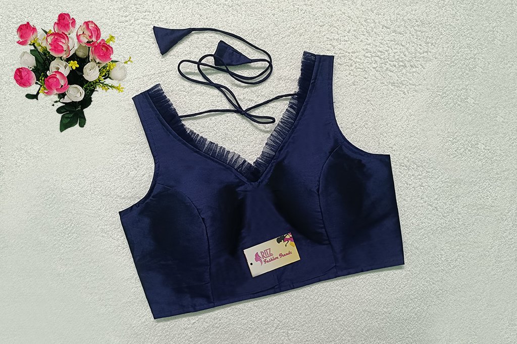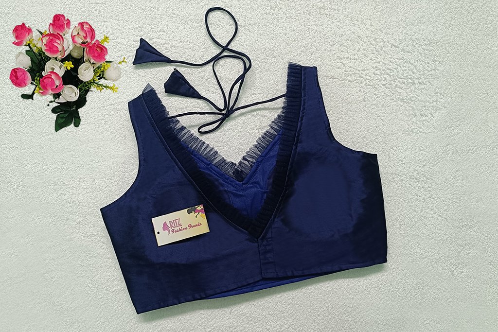 This is a Navy Blue Color Samo Silk Blouse. This Blouse is V-Neckline in both Frontside & Backside with Tie-Up. This is a Princess Cut, Padded, Sleeveless Blouse with Back Open. You can team it up with any contrast-colored Traditional/Printed Saree.