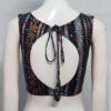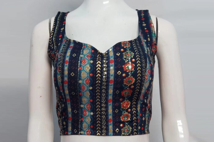 This is a Navy Blue Multi Color Rayon Blouse. This Blouse is Sweetheart Neckline in Frontside and Keyhole Neckline in Backside with Tie Up. This is a Princess Cut, Padded & Sleeveless Blouse with Back Open. You can team it up with any contrast colored Printed or Traditional Saree.