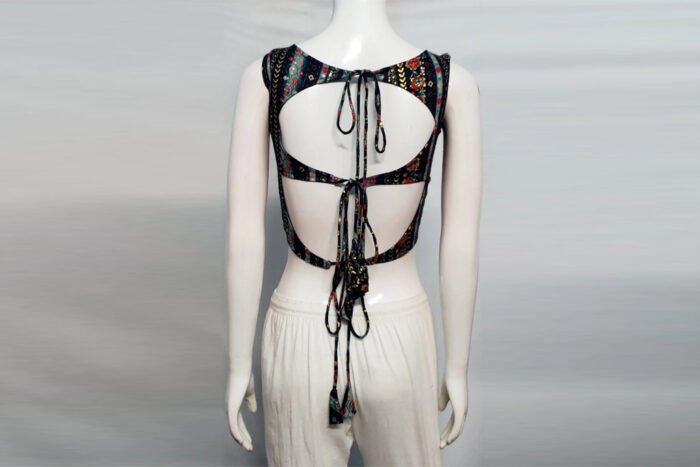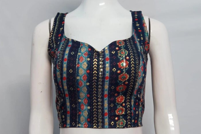 This is a Navy Blue Multi Color Rayon Blouse. This Blouse is Sweetheart Neckline in Frontside and Keyhole Neckline in Backside with Tie Up. This is a Princess Cut, Padded & Sleeveless Blouse with Back Open. You can team it up with any contrast colored Printed or Traditional Saree.