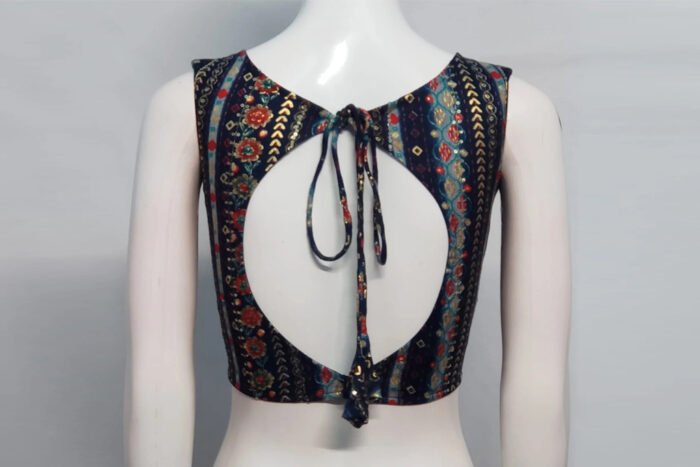 This is a Navy Blue Multi Color Rayon Blouse. This Blouse is Sweetheart Neckline in Frontside and Keyhole Neckline in Backside with Tie Up. This is a Princess Cut, Padded & Sleeveless Blouse with Back Open. You can team it up with any contrast colored Printed or Traditional Saree.