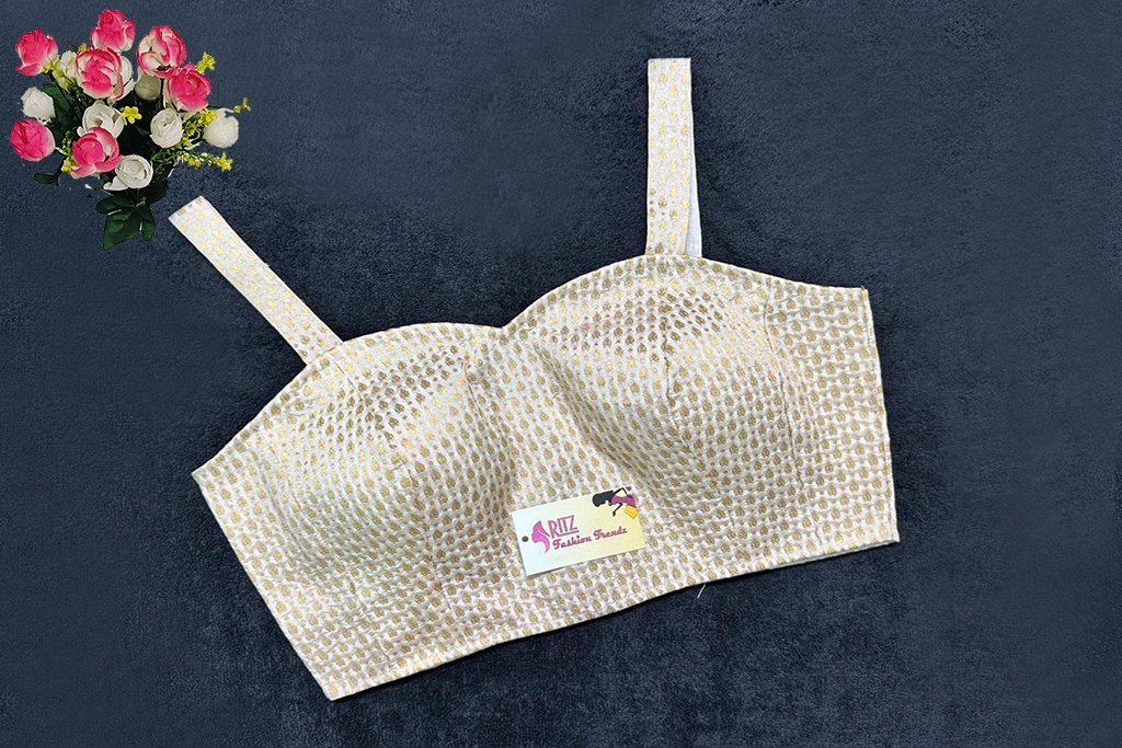 This is a Off-White Color Brocade Spaghetti. This is a Sweetheart Neckline Blouse in Frontside & Band Neckline in Backside. This is a Princess Cut, Padded, Sleeveless Blouse with Back Open. You can team it up with any contrast-colored Traditional/Printed Saree.