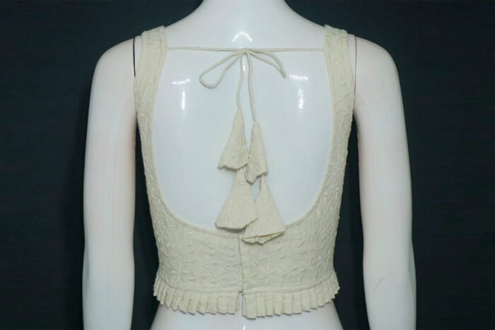 This is an Off-White Multi Color Cotton Hakoba Blouse with Gujarati Thread Embroidery and Mirror Work. This Blouse is V-Neckline in Frontside and U-Neckline in Backside with Tie Up. This is a Princess Cut Padded Sleeveless Blouse with Back Open. You can team it up with any contrast colored Traditional Saree.