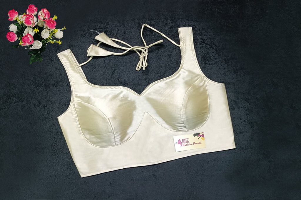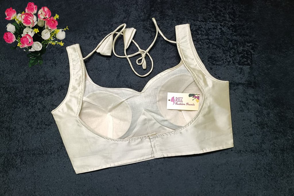 This is a Cream Color Samo Silk Blouse. This is Sweetheart Neckline in Frontside & U-Neckline in Backside with Tie-Up. This is a Princess Cut, Padded, Sleeveless Blouse with Back Open. You can team it up with any contrast-colored Traditional/Printed Saree.