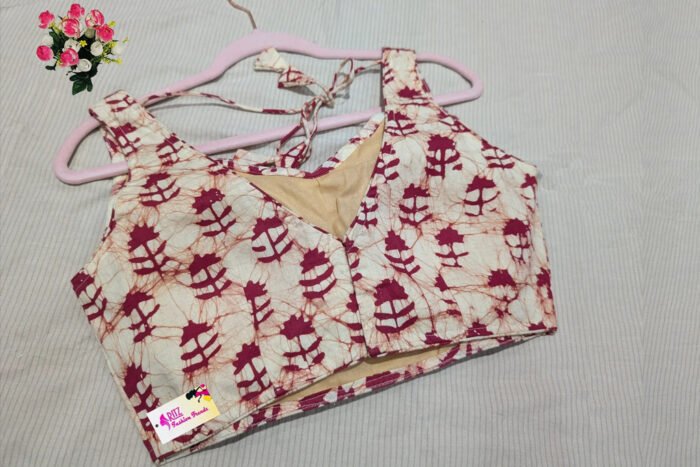 This is an Off-White Color Cotton Batik Printed Blouse. It is V-Neckline in Frontside and Backside with Tie-Up. This is a Princess Cut Padded Blouse. This Blouse is Sleeveless and Back Open. You can team it up with any contrast colored Printed/Traditional Saree.