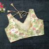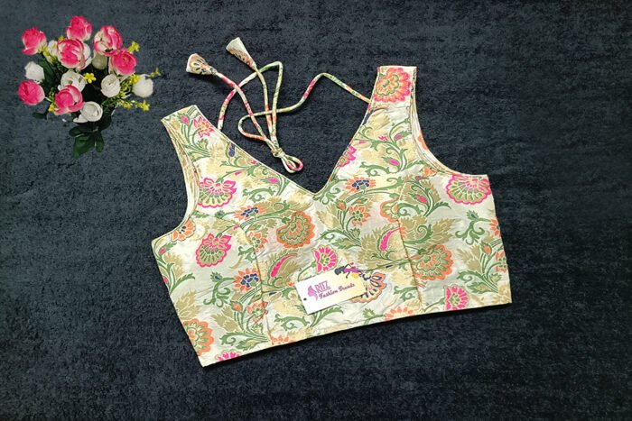 This is an Off-White Meena Kari Brocade Blouse. This Blouse is V-Neckline in Frontside & Backside with Tie-Up. This is a Princess Cut, Padded, Sleeveless Blouse with Back Open. You can team it up with any contrast-colored Traditional/Printed Saree.