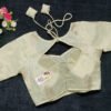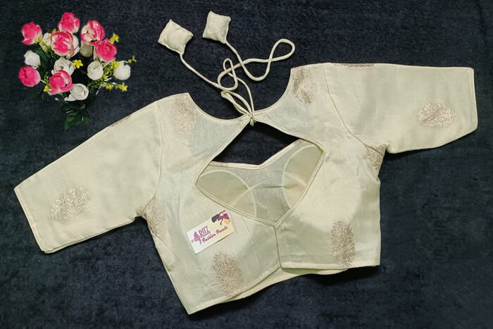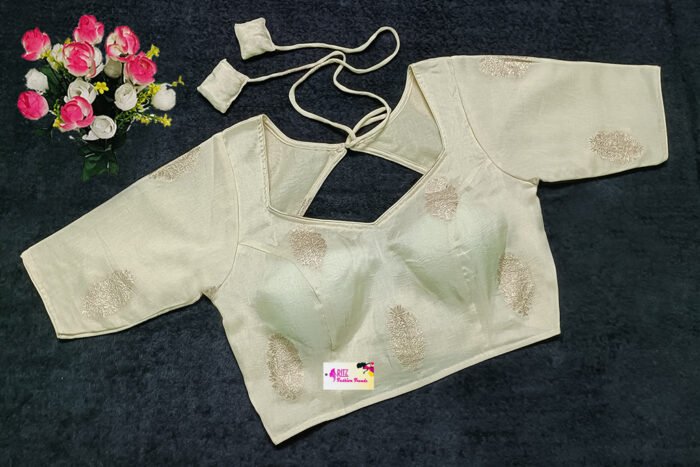This is a Cream Color Russian Silk Blouse. This Blouse is Semi-Sweetheart Neckline in Frontside & Diamond Keyhole Neckline in Backside with Tie-Up. This is a Princess Cut, Padded, Glass Sleeve Blouse with Back Open. You can team it up with any contrast-colored Traditional/Printed Saree.