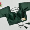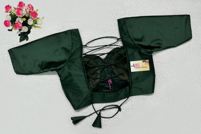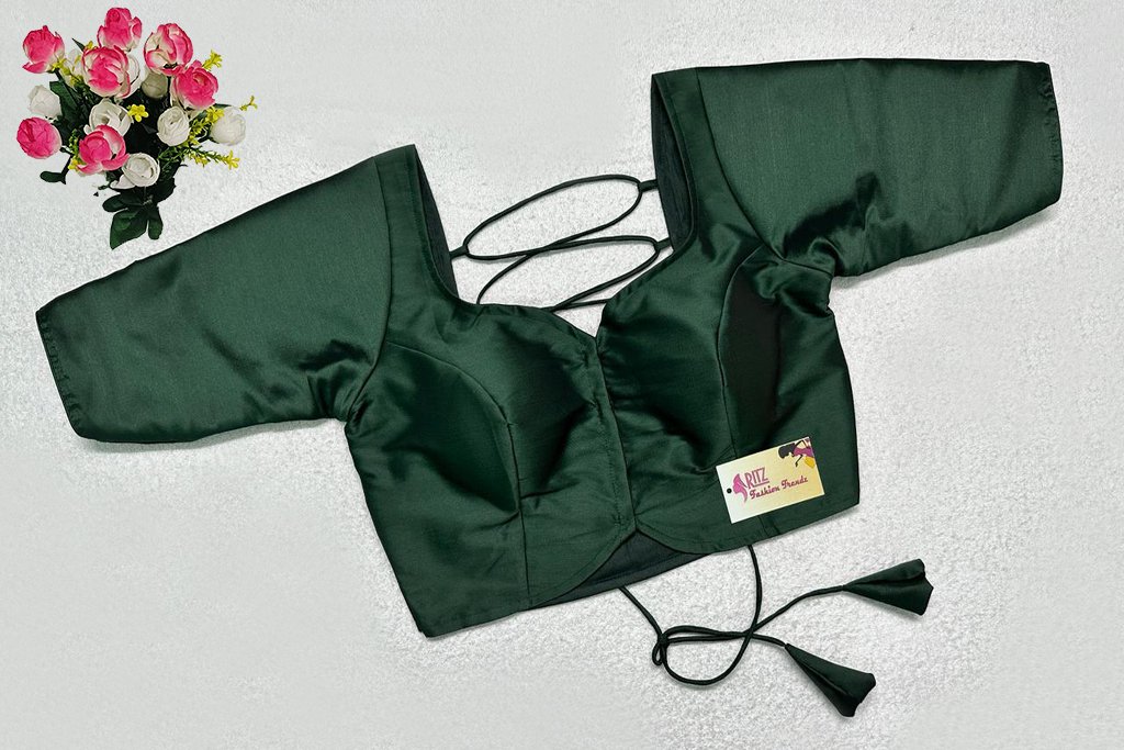 This is a Bottle Green Color Samo Silk Blouse. This is Sweetheart Neckline in Frontside & Square Neckline in Backside with Tie-Up. This is a Princess Cut, Padded, Glass Sleeve Blouse with Front Open. You can team it up with any contrast-colored Traditional/Printed Saree.