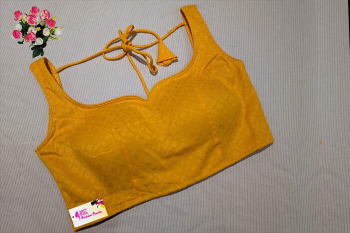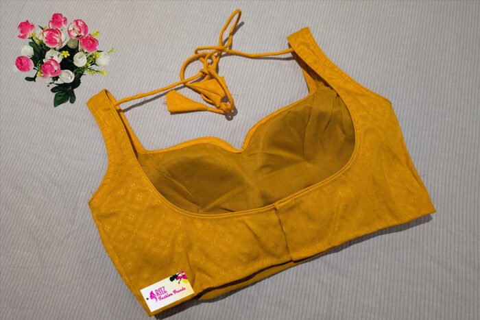 This is a Yellow Color Brocade Blouse. It is Sweetheart Neckline in Frontside and U-Neckline in Backside with Tie-Up. This is a Princess Cut, Padded, Sleeveless Blouse with Back Open. You can team it up with any contrast colored Printed/Traditional Saree.