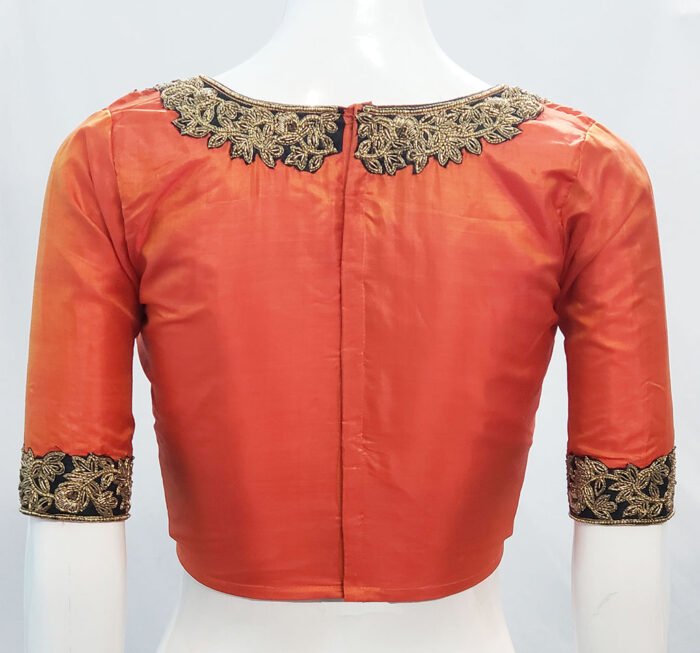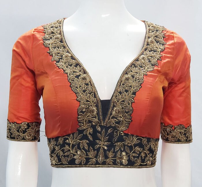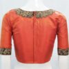 This is an Orange Color Embroidered Pure Silk Blouse. This Blouse is Sweetheart Neckline in Frontside and Boat Neckline in Backside. This Blouse has very attractive Zari Lace work in Neckline, Waist & Sleeves. This is a Princess Cut, Padded, Glass Sleeve Blouse with Back Open. You can team it up with any contrast colored Printed or Traditional Saree.