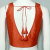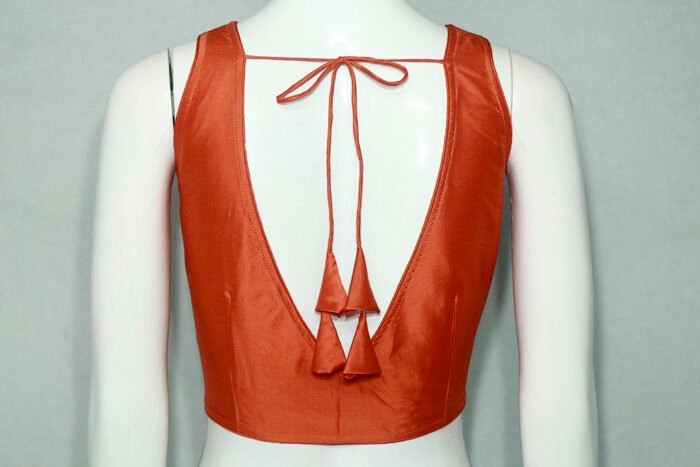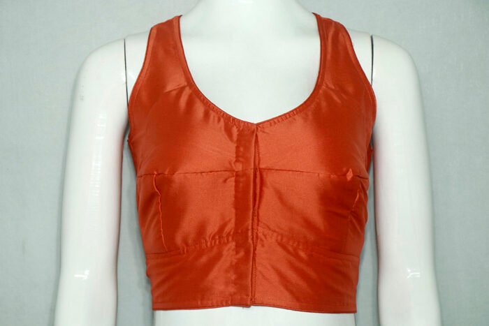 This is a Rust Color Samo Silk Blouse. This Blouse is U Neckline in Frontside and V Neckline in Backside with Tie-Up. This is a Choli Cut Non- Padded Blouse with Sponge . This is a Plain Motif Sleeveless Blouse With Front Open. You can team it up with any contrast color Printed or Traditional Saree.