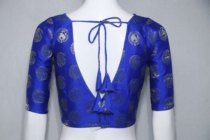 This is a Royal Blue Color Satin Benarasi Blouse With Paisley Motif of Zari Work. It is V Neckline in Frontside and Backside with Tie Up. A Beautiful Satin Benarasi Blouse Is Made Of Very Soft Satin Fabric. This Blouse Opens From The Back And Has Elbow Length Sleeves. There Is Enough Margin In Each Blouse To Make It Bigger By a Few Inches. This Blouse Is Fully Stitched and Ready To Wear. We assure the authenticity and quality of our products. You can team it up with any contrast-colored Traditional Saree.