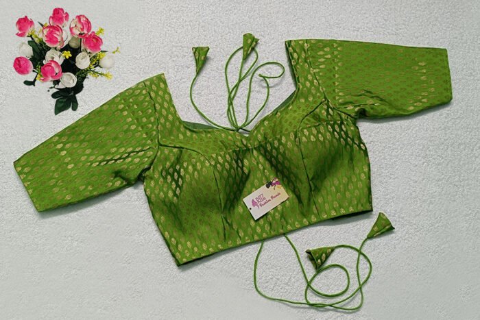This is Parrot Green Color Brocade Blouse. This is Sweetheart-Neckline in Frontside & Diamond Key-Hole Neckline in Backside with Tie-Up. This is a Princess Cut, Padded, Glass Sleeve Blouse with Back Open. You can team it up with any contrast-colored Traditional/Printed Saree.