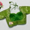 This is a Parrot Green Color Brocade Blouse. This is Sweetheart-Neckline in Frontside & U-Neckline in Backside with Tie-Up. This is a Princess Cut, Padded, Glass Sleeve Blouse with Back Open. You can team it up with any contrast-colored Traditional/Printed Saree.