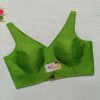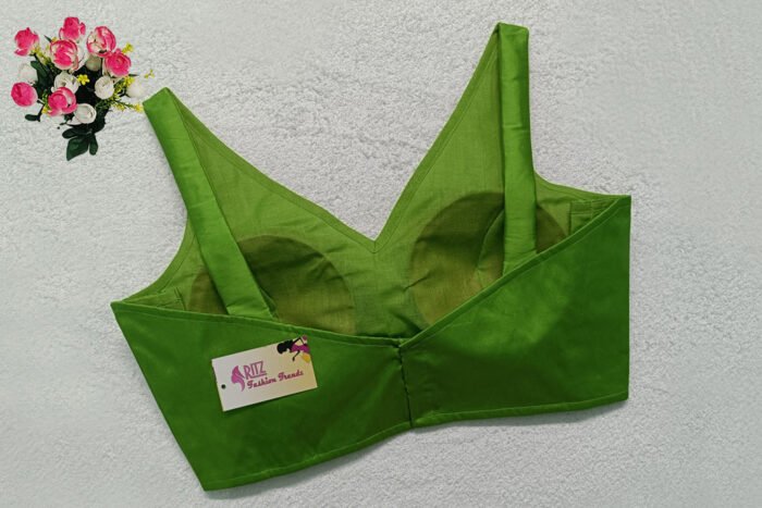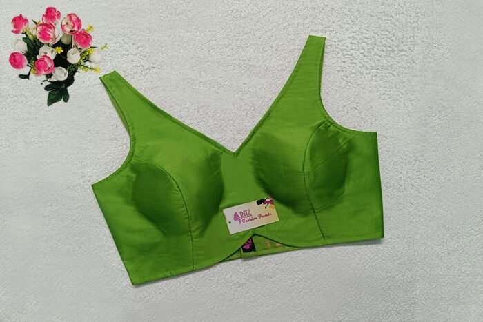 This is a Parrot Green Color Samo Silk Blouse. This Blouse is V-Neckline in Frontside & Band-Neckline in Backside with Straps. This is a Princess Cut, Padded, Sleeveless Blouse with Back Open. You can team it up with any contrast-colored Traditional/Printed Saree.