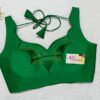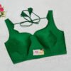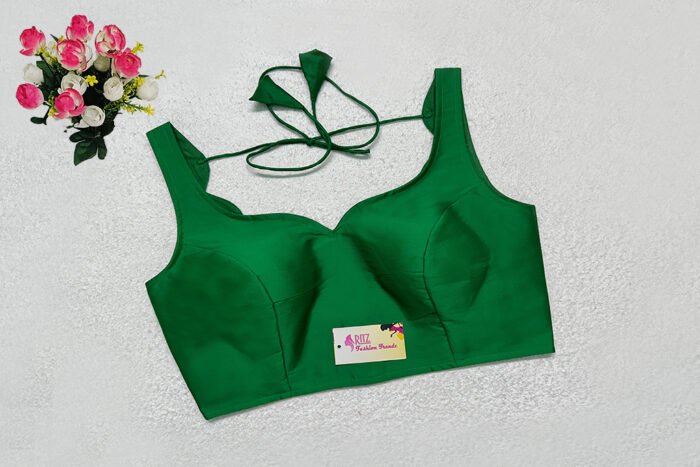 This is an Emerald Green Color Samo Silk Blouse. This is Sweetheart Neckline in Frontside & Scallop Neckline in Backside with Tie-Up. This is a Princess Cut, Padded, Sleeveless Blouse with Back Open. You can team it up with any contrast-colored Traditional/Printed Saree.