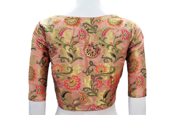 This is a Peach Multi Color Meena Kari Brocade Blouse. This Blouse is V-Neckline in Frontside and Boat Neckline in Backside. This is a Princess Cut, Padded, Glass Sleeve Blouse with Front Open. You can team it up with any contrast colored Printed or Traditional Saree.