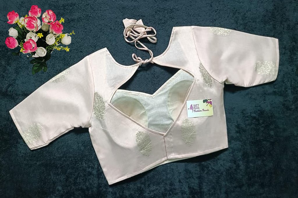 This is a Peach Color Russian Silk Blouse. This is Sweetheart Neckline in Frontside & Kay-Hole Neckline in Backside with Tie-Up. This is a Princess Cut, Padded, Glass Sleeve Blouse with Back Open. You can team it up with any contrast-colored Traditional/Printed Saree.