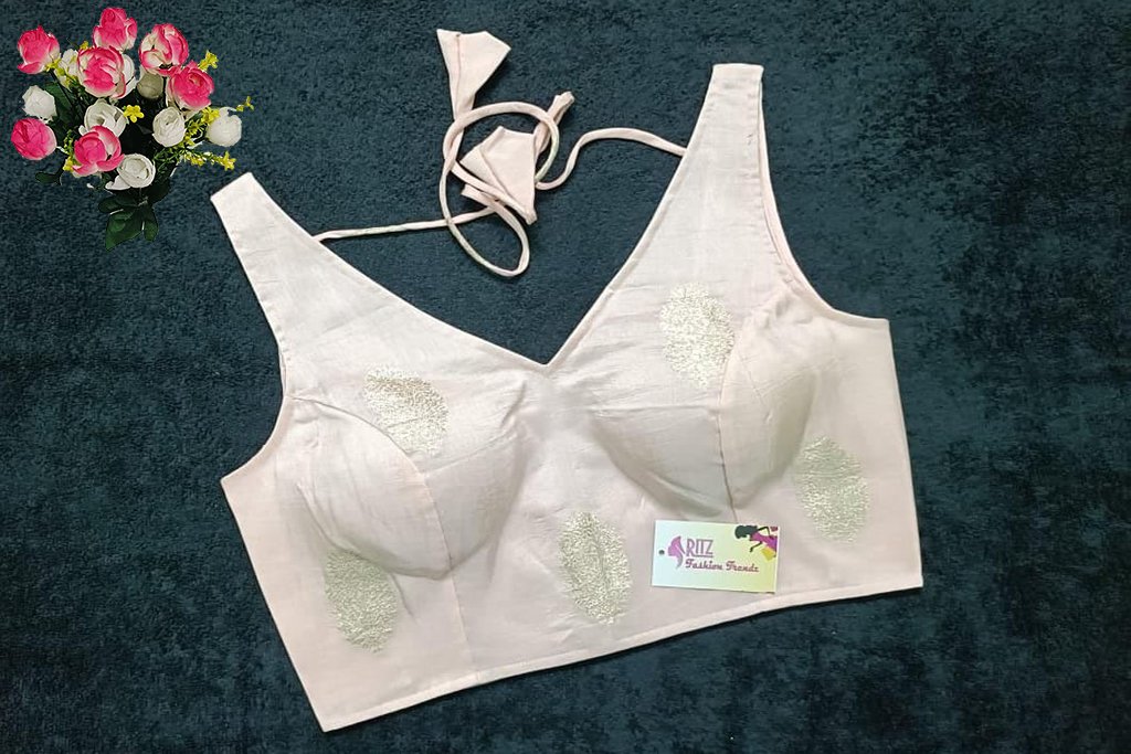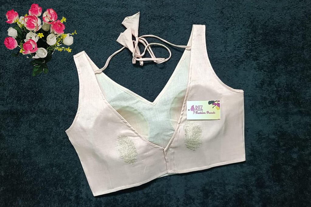 This is a Peach Color Russian Silk Blouse. This is V-Neckline in both Frontside & Backside with Tie-Up. This is a Princess Cut, Padded, Sleeveless Blouse with Back Open. You can team it up with any contrast-colored Traditional/Printed Saree.
