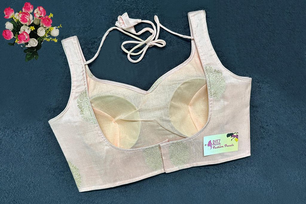 This is a Peach Color Russian Silk Blouse. This is a Sweetheart Neckline Blouse in Frontside & U-Neckline in Backside with Tie-Up. This is a Princess Cut, Padded, Sleeveless Blouse with Back Open. You can team it up with any contrast-colored Traditional/Printed Saree.