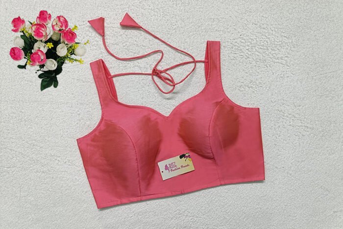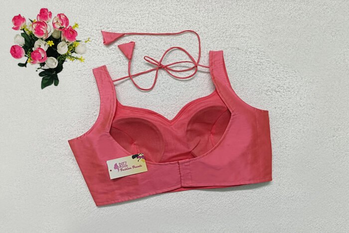 This is a Peach Color Samo Silk Blouse. This Blouse is Sweetheart Neckline in Frontside & U-Neckline in Backside with Backside. This is a Princess Cut, Padded, Sleeveless Blouse with Back Open. You can team it up with any contrast-colored Traditional/Printed Saree.
